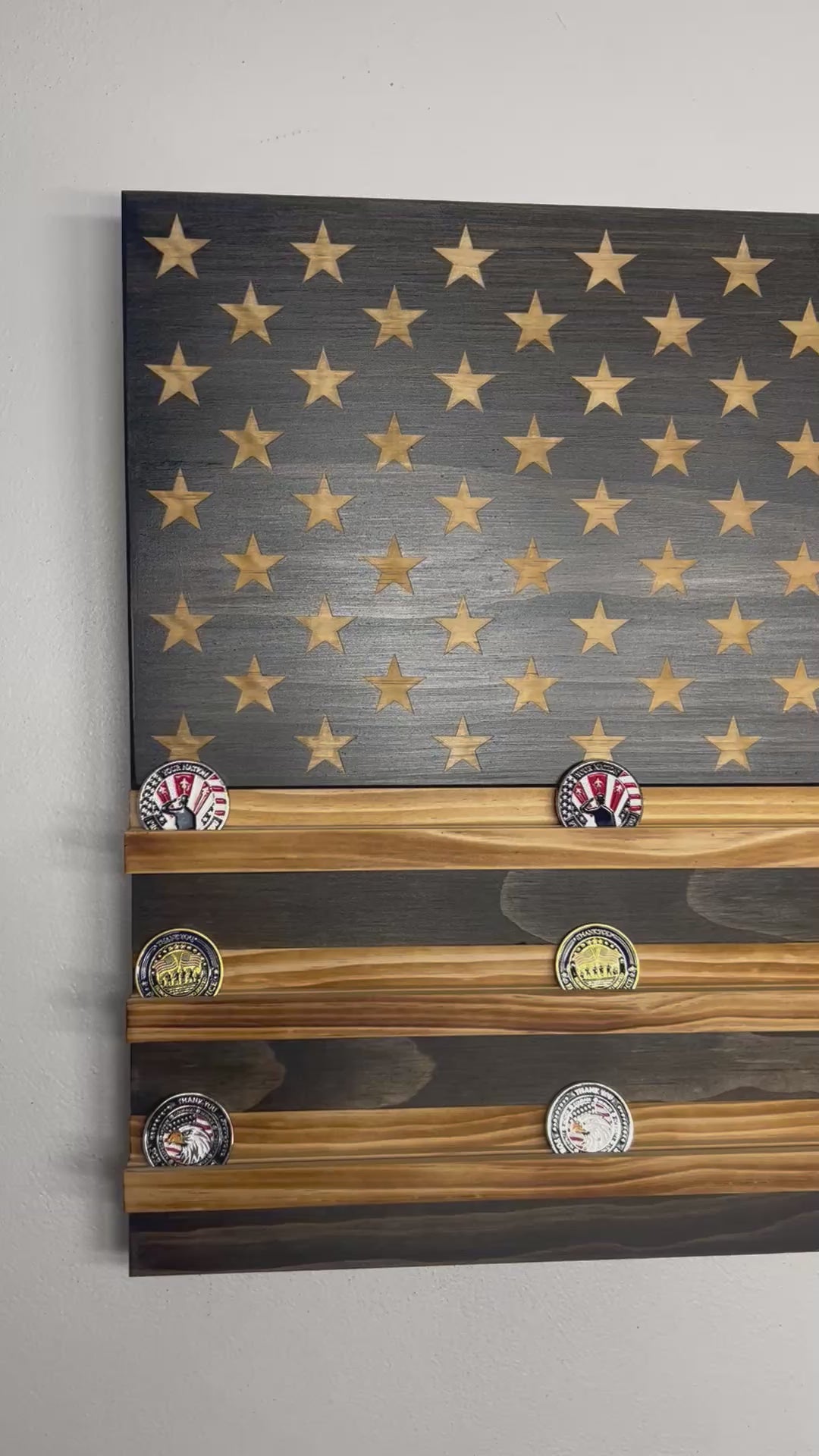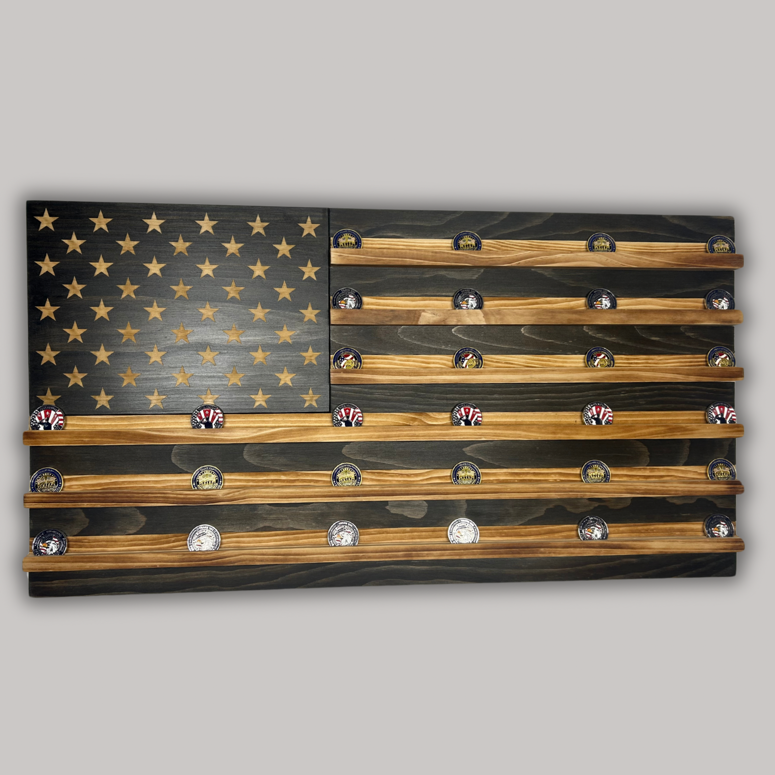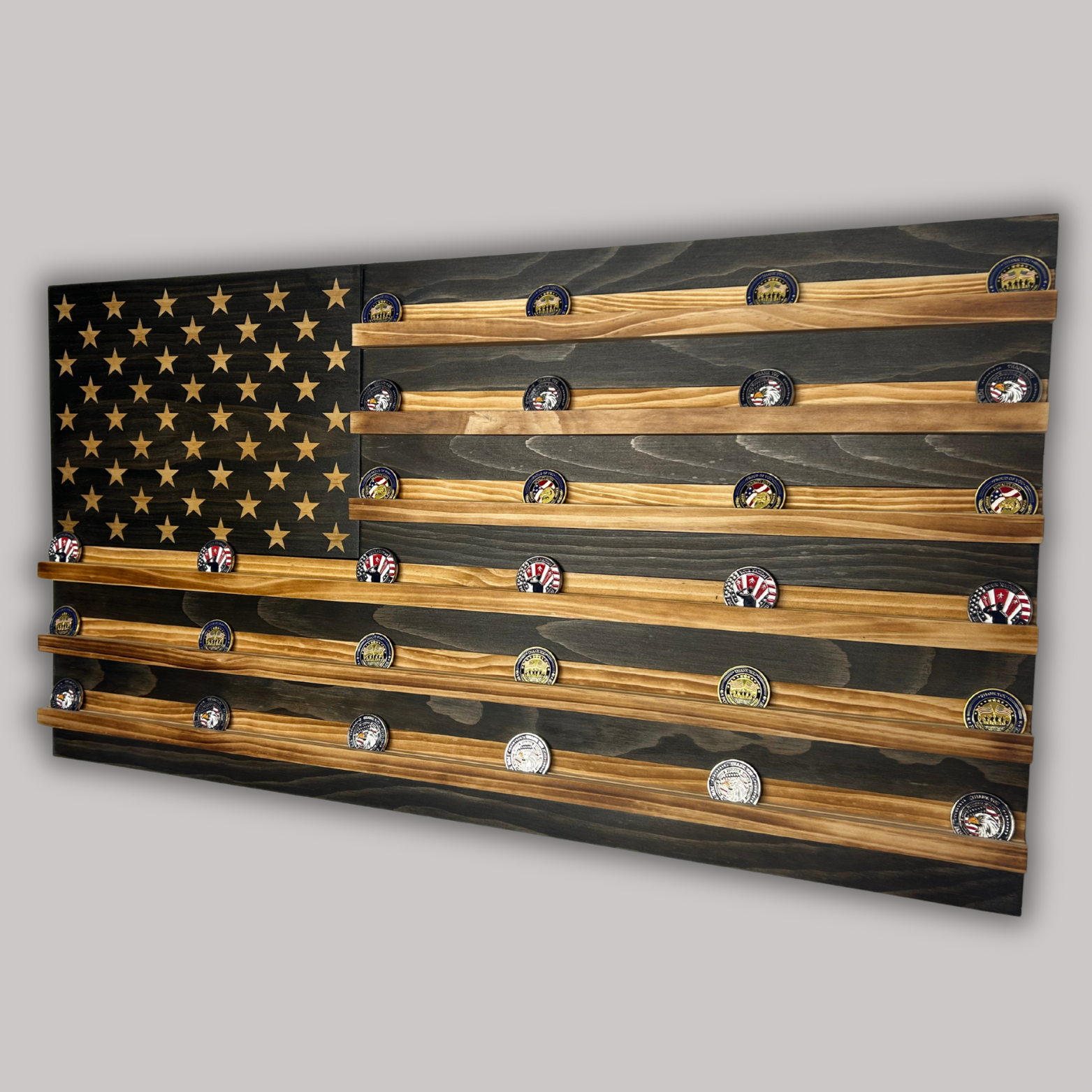Wooden American Flag Challenge Coin Display 37x19" (Black/White)