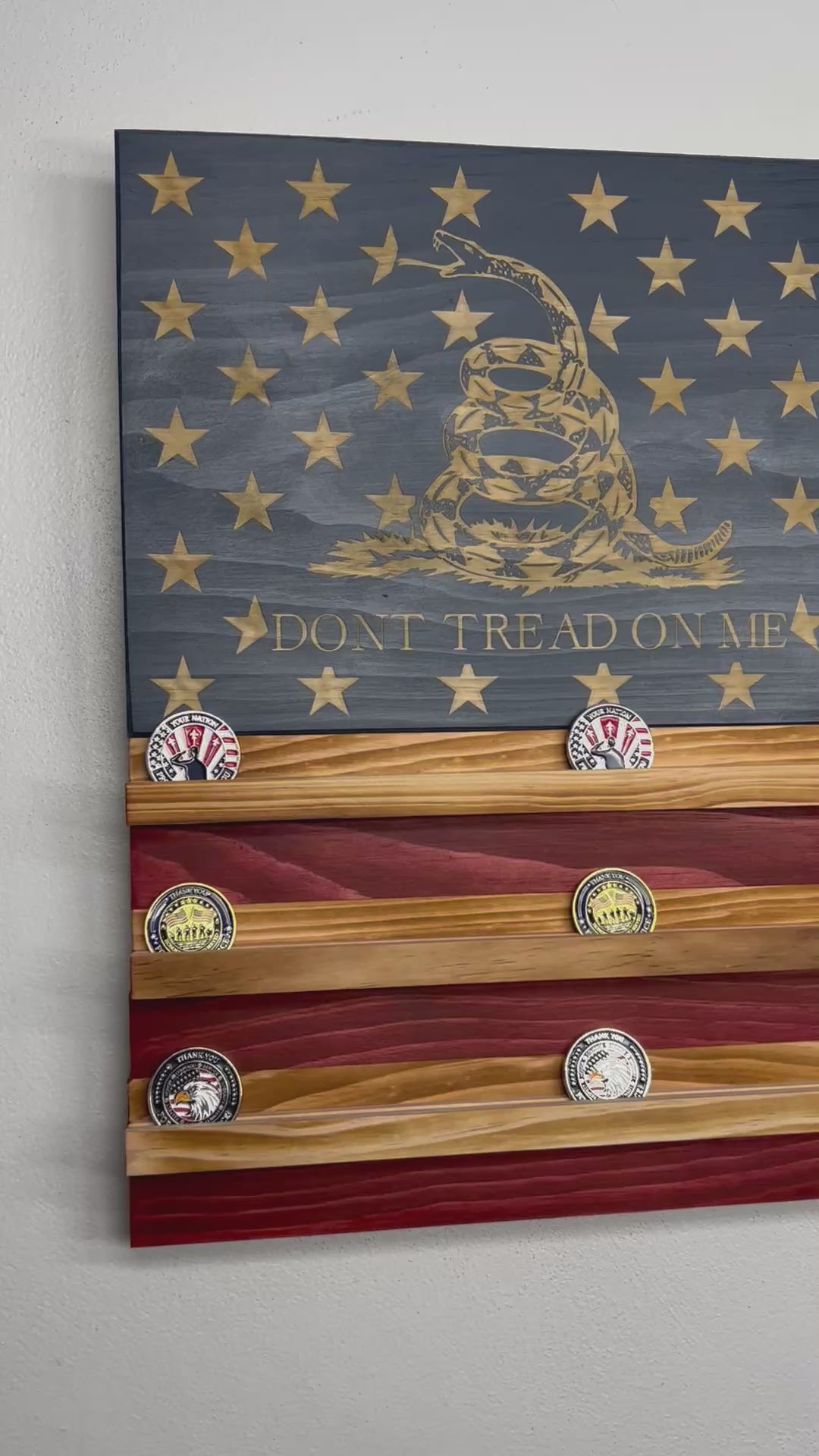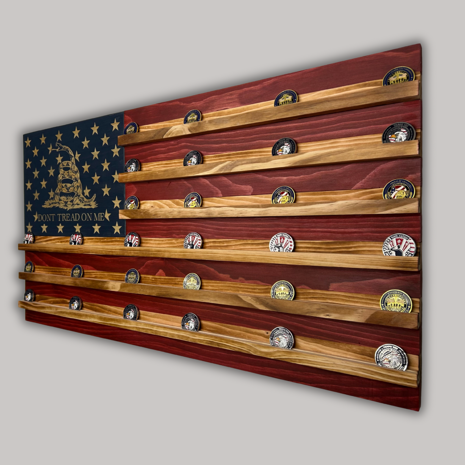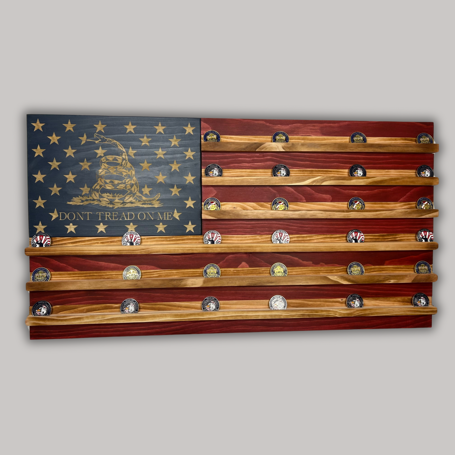 Wooden American Flag Challenge Coin Display 37x19" (Don't Tread On Me)