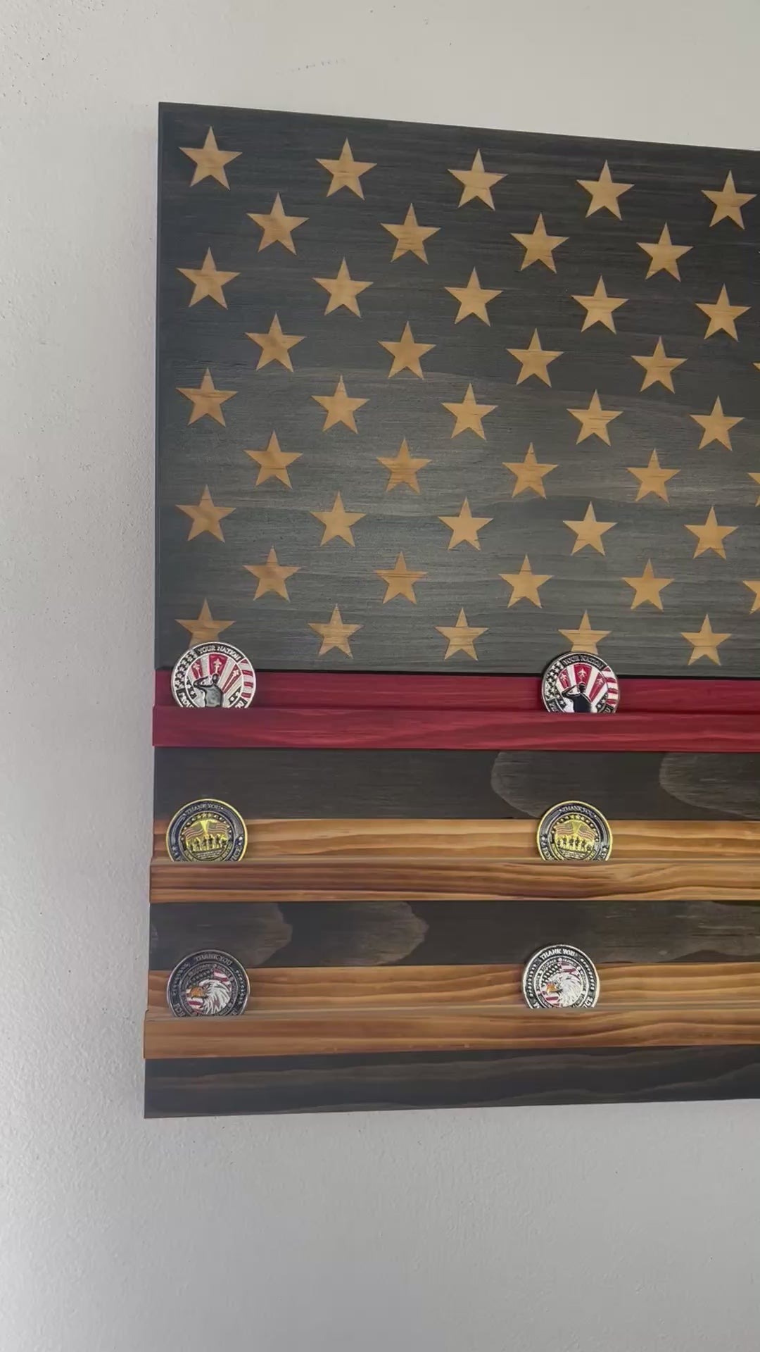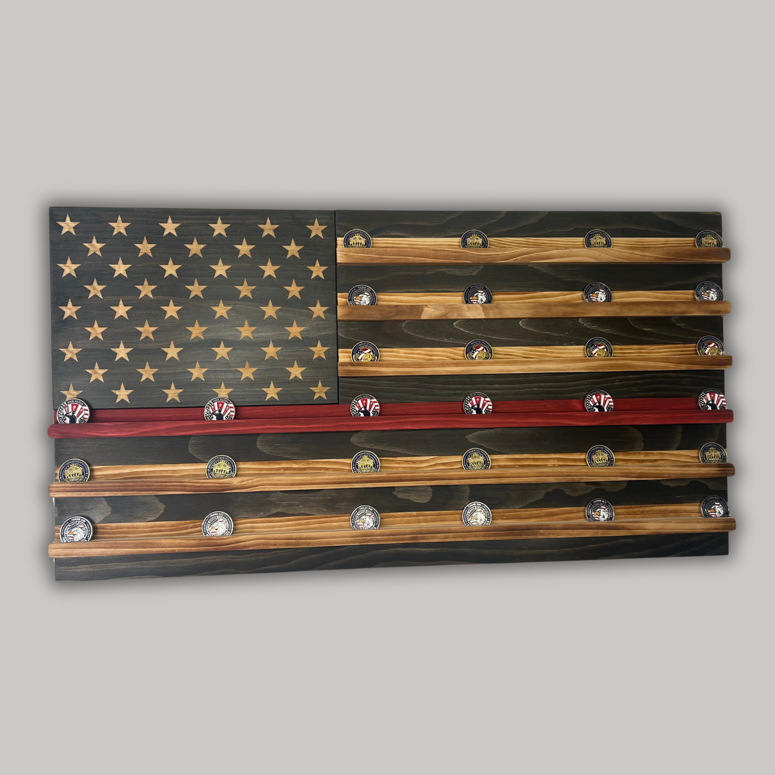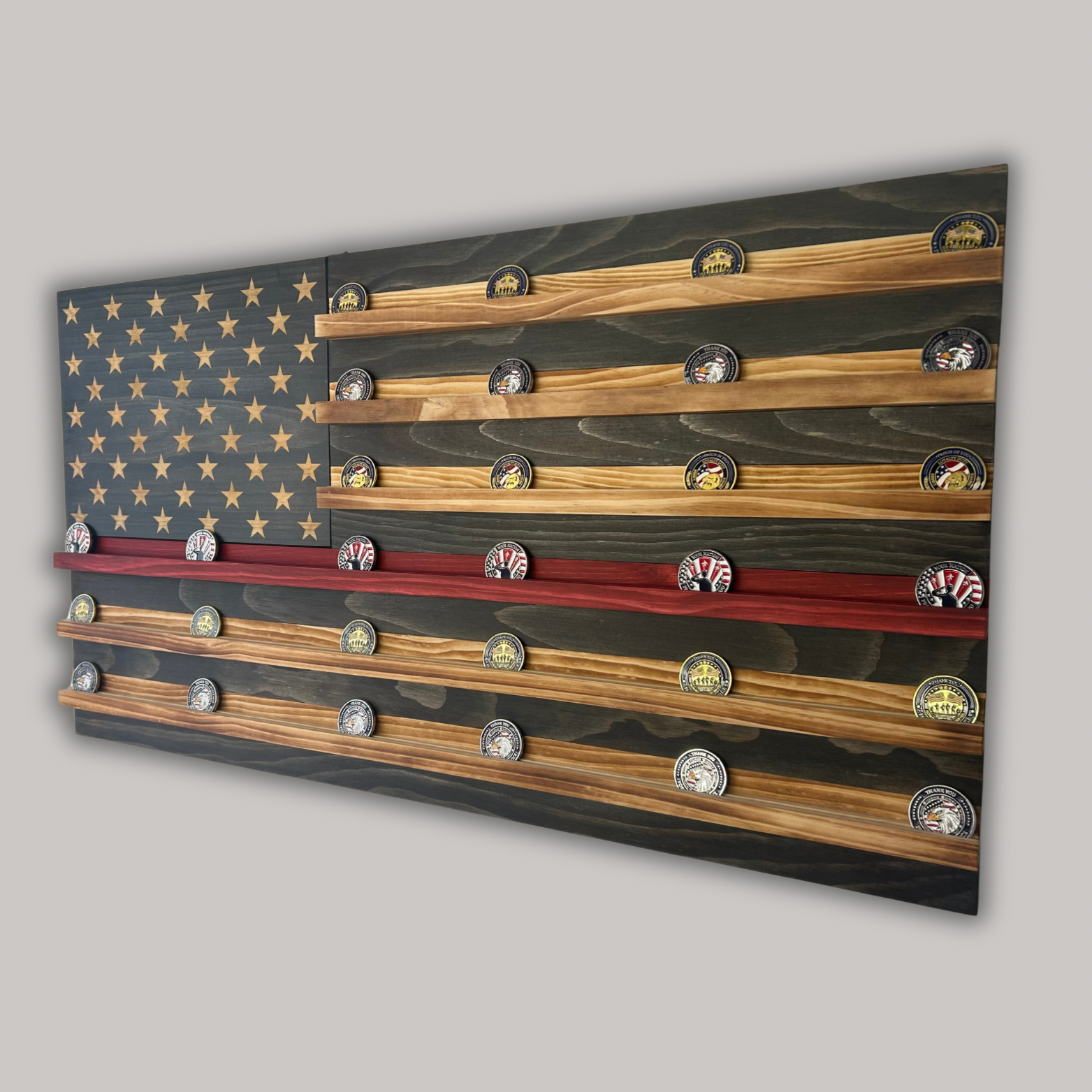 Wooden American Flag Challenge Coin Display 37x19" (Thin Red Line)